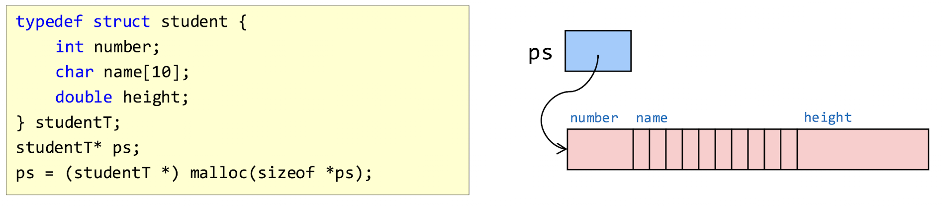 : 구조체를 가리키는 포인터. 포인터 자체만을 위한 메모리를 확보하며, 사용시에는 적절한 초기화 필요